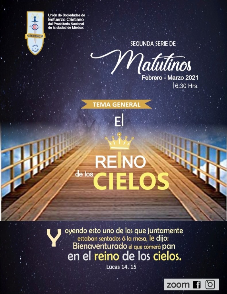| 14/FEB. | “De los elegidos” | SIEC “SEGUIDORES DE LA VERDAD” de la INPC “BETHEL”, San Andrés Totoltepec, Tlalpan, CDMX. | GIEC “DANIEL Y SUS AMIGOS” de la INPC “EMMANUEL”, Zacualtipán, Hgo. |